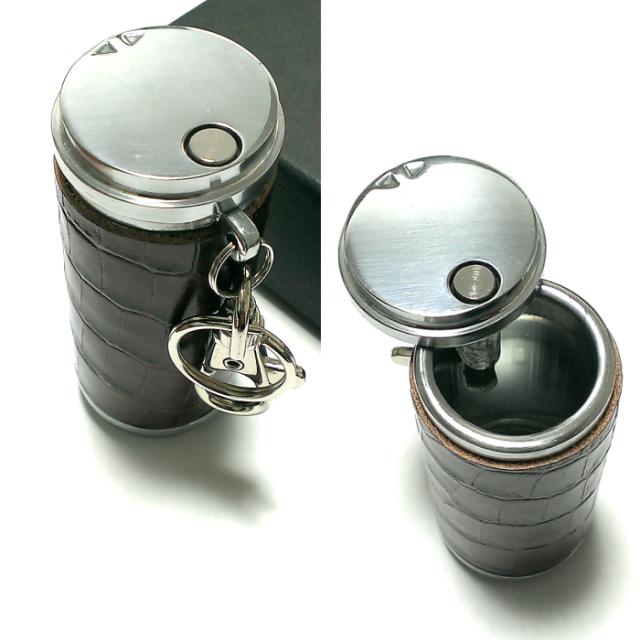 クロコダイル風に型押しした茶の本牛革をアルミ製の本体に巻いた携帯灰皿。