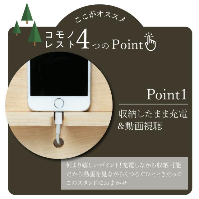 何より嬉しいポイント!充電しながら収納可能。 だから、動画を見ながらくつろぐひとときだって このスタンドにおまかせ。 厚みのある木製ならではの安定感でがたつきゼロ。 もちろん、コードの位置を変えて画面を横にしてもOK。 ちょうどいい角度で画面を見れるから、その快適さに毎日がちょっとハッピーな気分に♪