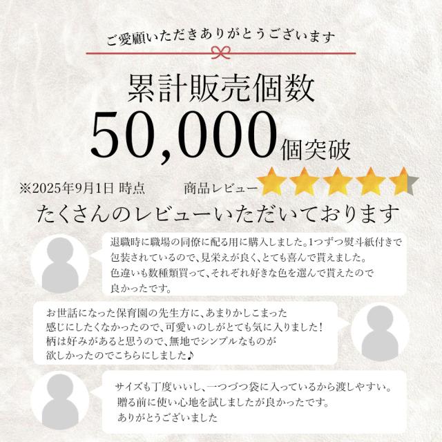 - サイズも丁度いいし、一つづつ袋に入っているかる渡しやすい。 贈る前に使い心地を試しましたが良かったです。 ありがとうございました