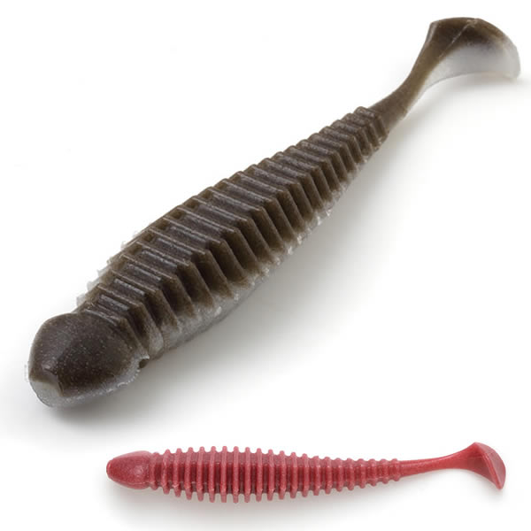 ●リグを選ばない使いやすさと、バルキーな存在感。ボディのリブが創り出す太い波動。そして特徴的なアンクルテール。女性の足首のようなセクシーなテール部分は、極わずかな水流でも細い足首が敏感に反応し、魅力的なナチュラルアクションを発生させます。