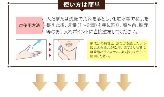 入浴後または洗顔後、適量(1〜2滴)を手に取り、顔や首、胸元等のお手入れポイントに直接塗布してください。