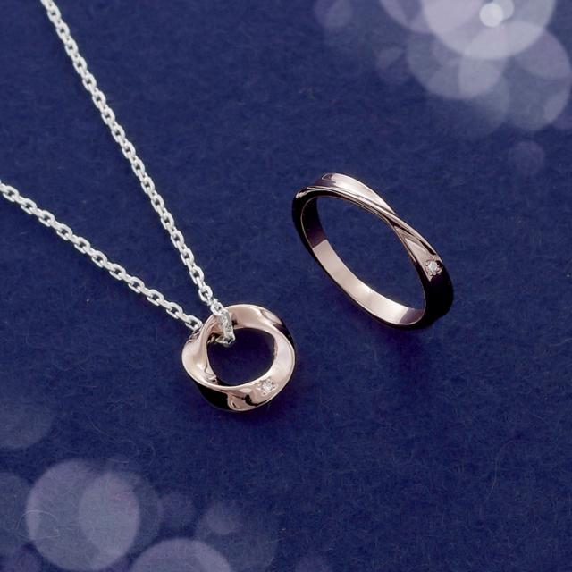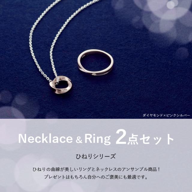ひねりの曲線が美しいリングとネックレスのアンサンブル2点セット。プレゼントはもちろん自分へのご褒美にも最適です。リング内側に名入れ刻印が可能で特別感アップ。高級感のあるレザー調ジュエリーケース付き。ダイヤモンド×ピンクシルバー