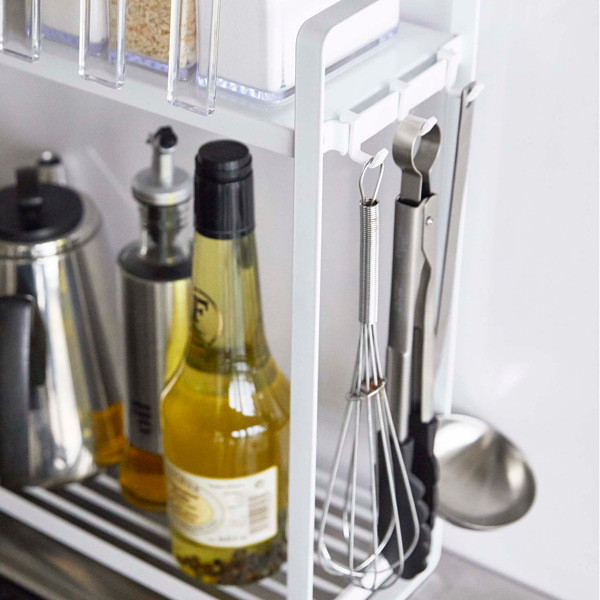 小物をかけるのに便利なフックが3個付属しています。ラックの両サイドに付けて小物を手の届くところにかければ、お料理の動線がスムーズになります。