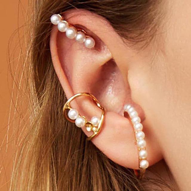 ゴールドメッキした大きなリングカフにイミテーションパールをセットしたイヤーカフや小振りなイヤーカフやお洒落なデザインに真珠を散りばめたイヤーカフを3個セットにしたノンホールピアス。