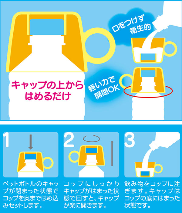 ペットボトルのキャップの上からはめるだけで、いつでもどこでもコップ飲みができます。ペットボトルに口をつけず、コップで飲むことができるので飲み物も衛生的に保てます。