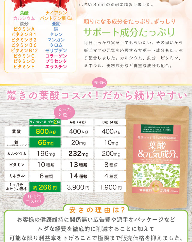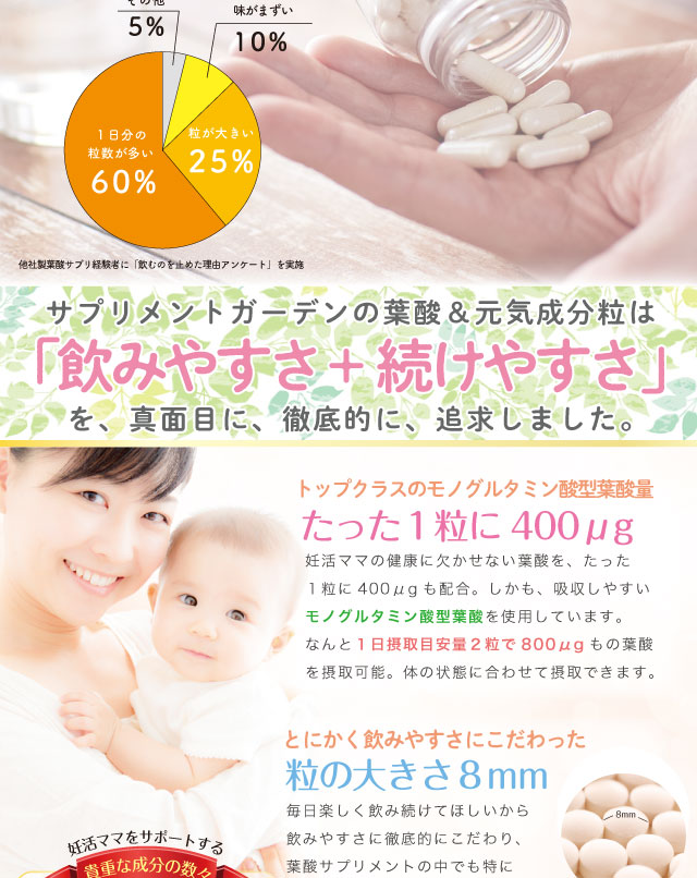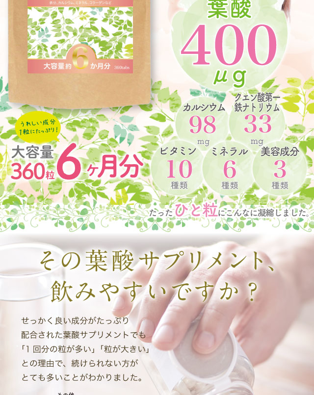 妊活ママにとって大事な成分である「葉酸」。その中でも特に吸収されやすい「モノグルタミン酸型葉酸」を、なんとたった1粒に400μg配合しました。それが6ヶ月分360粒も入っています。