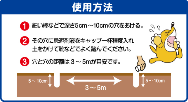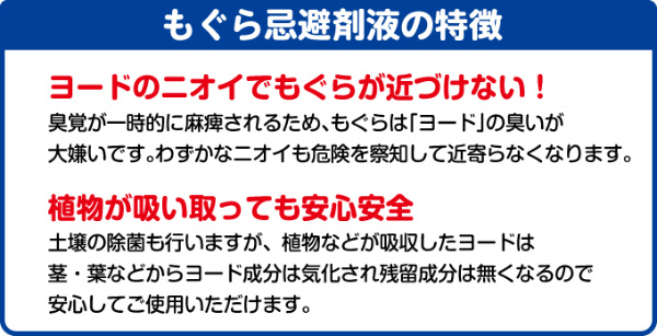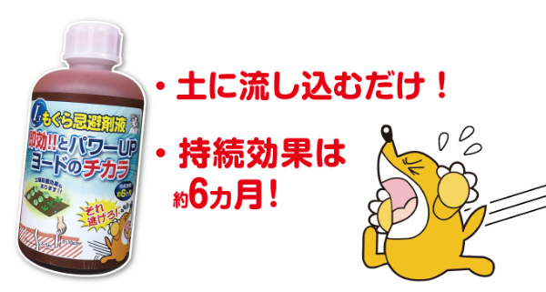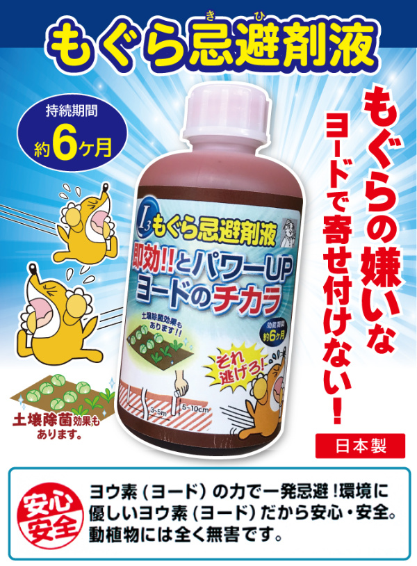 もぐらが苦手なヨウ素のにおいで、お庭や畑をガード!天然素材のヨードだから人体はもちろん、動植物にも無害です。3〜5m毎にキャップ1杯を5〜10cmの穴に注ぐだけの簡単作業。