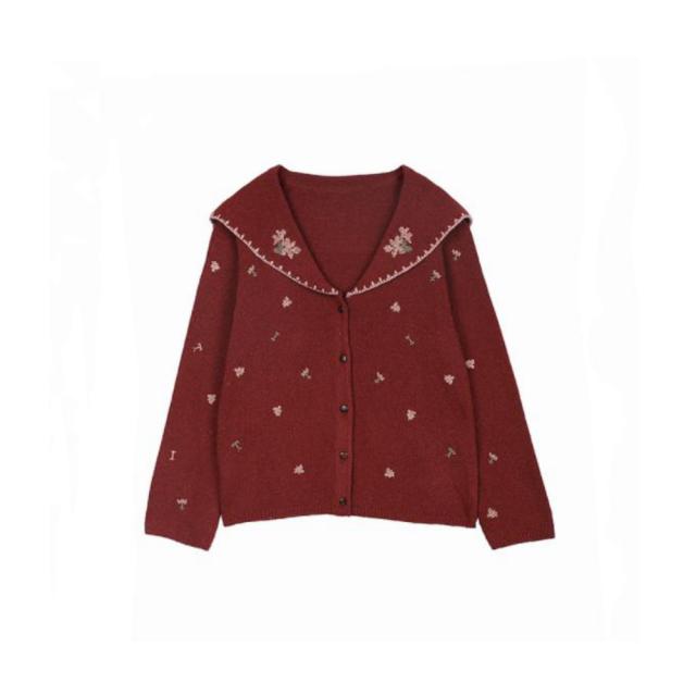 カーディガン セーラー 襟 花柄 ワインレッド 冬 秋 春 冬物 暖かい セーター ニット 可愛い 森 森ガール 自然 ふわ ゆる 癒し かわいい ガーリー