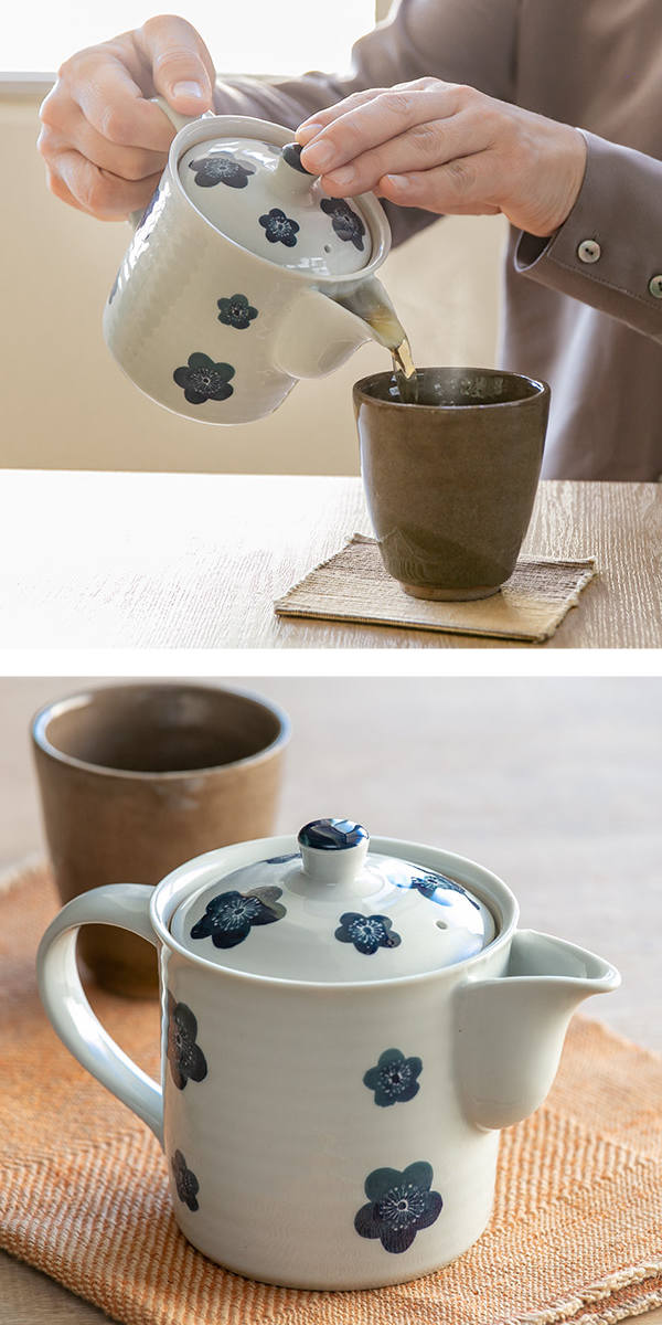 切立ポット 400ml 青小梅 茶こし付き 急須 ポット ティーポット 陶器 ( 食洗機対応 切立急須 茶漉し付き 2〜3杯 切立 紅茶ポット 和風 花柄 茶漉し お茶用品 ティーウェア 茶器 )