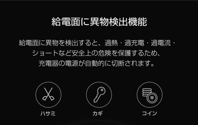 高級感のある2.5Dガラスパネルを採用し、シンプルで洗練されたデザインを実現。異物検出機能(FOD)を搭載しており、金属などを感知すると自動で給電を停止し、安全性にも配慮しています。