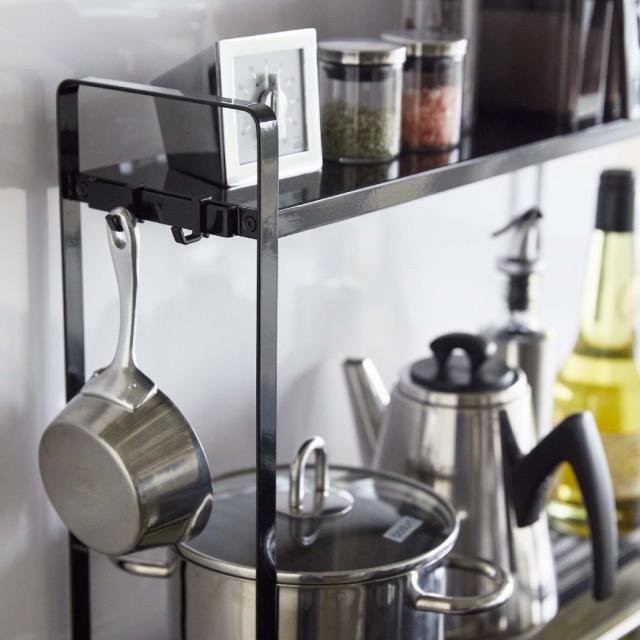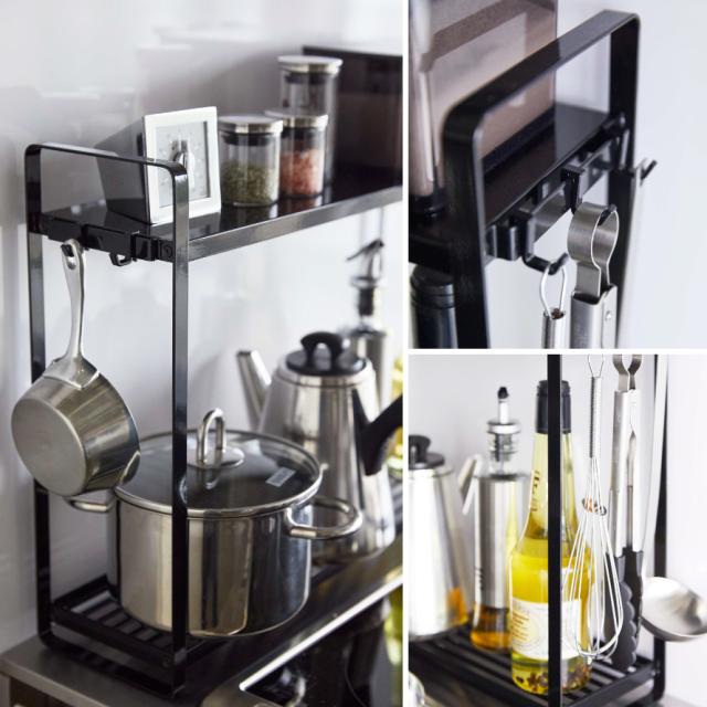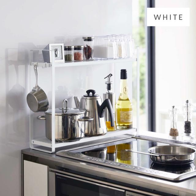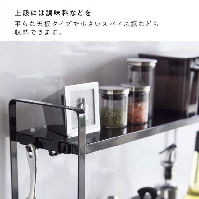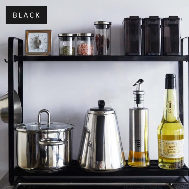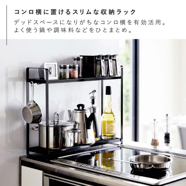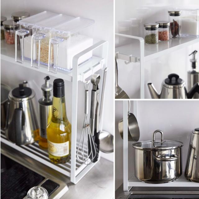 調味料ストッカーやスパイス瓶、キャニスター、鍋やケトルまで一括収納できる便利な2段棚のコンロ横ラック。奥行14cmだからコンロ横にすっきり収まるサイズです。見た目もシンプルでおしゃれに収納できます。