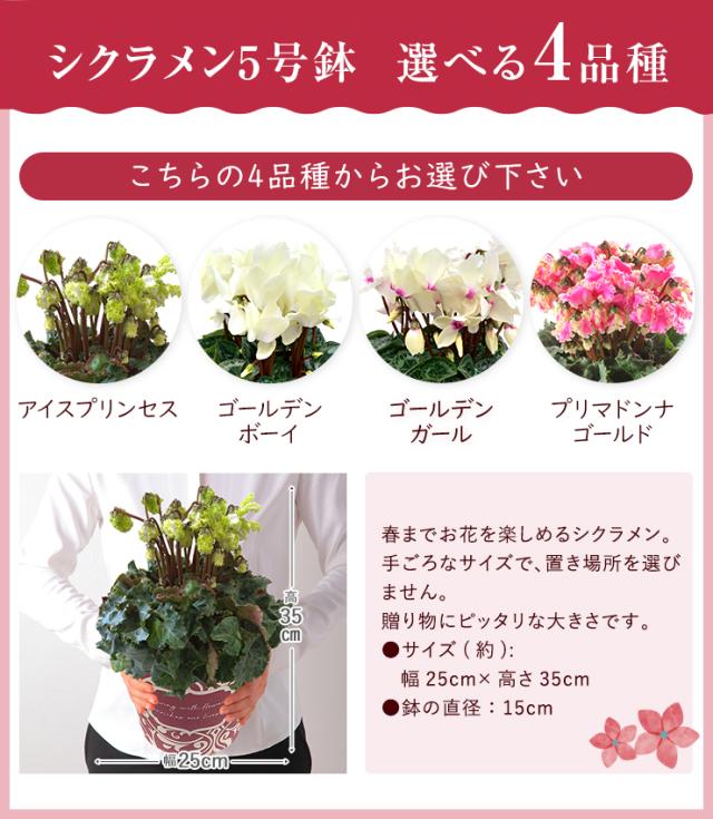 シクラメン 鉢植え アイスプリンセス ゴールデンボーイ ゴールデンガール プリマドンナ 花 ギフト プレゼント お花 5号鉢 鉢花 花鉢 しくらめん 5号 鉢 東北〜関西 送料無料 お歳暮 クリスマス 誕生日 フラワーギフト 花のギフト社