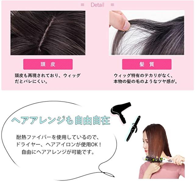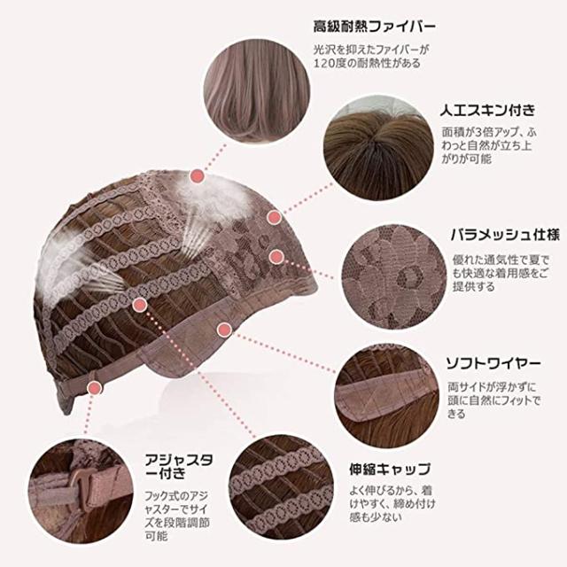 【耐熱性】: 高級耐熱ファイバーを採用して、今まで気になっていたウィッグ特有のテカリ感を抑えて、より人毛に近づけたしっとりとした柔らかな手触ります。まるで自分の髪のように自然で、通気性が良く涼しく過ごすことができます。