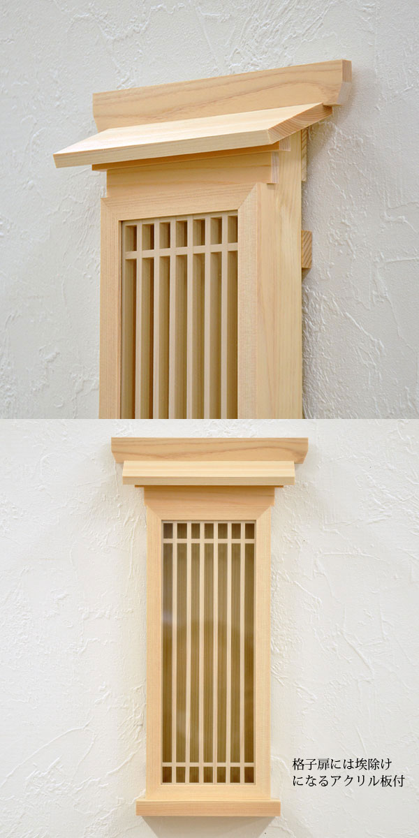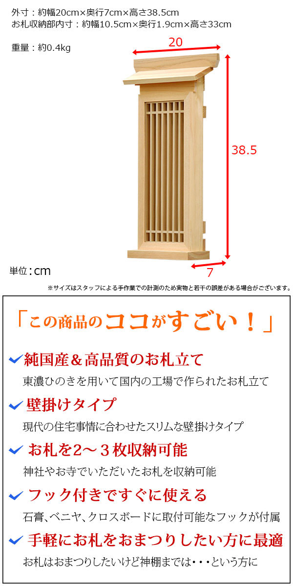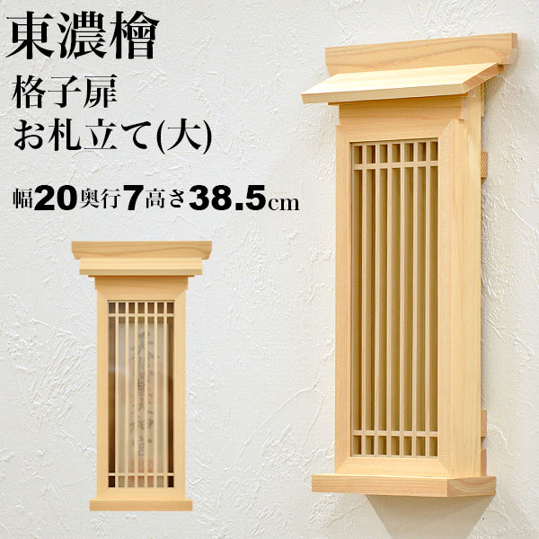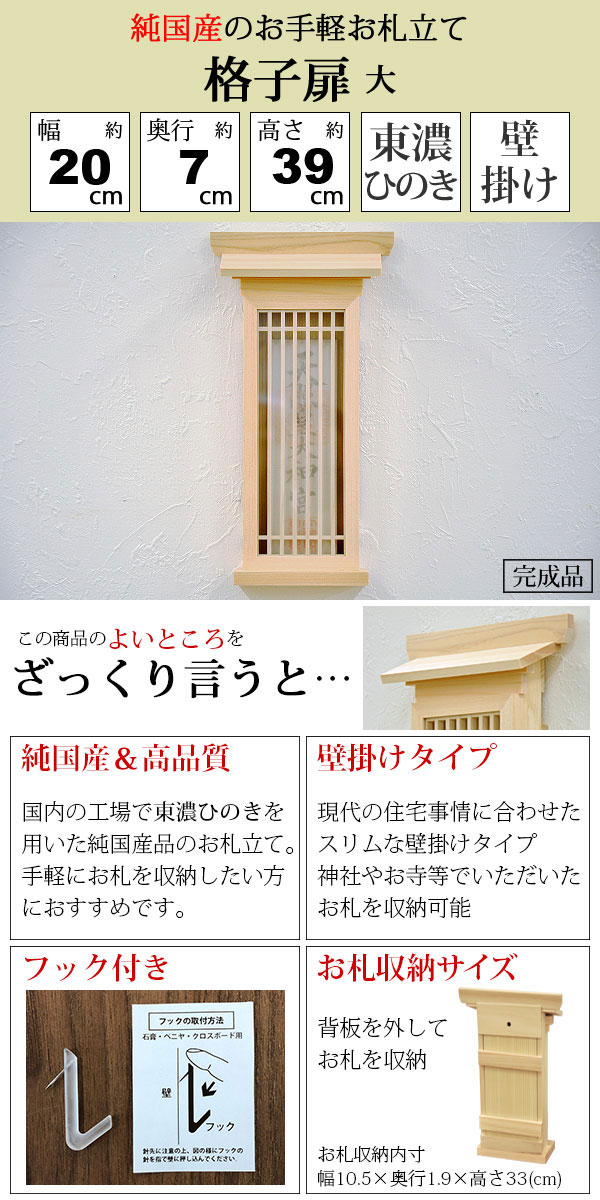 お札立て 壁掛け 日本製 東濃桧 モダン おしゃれ 御札立て お札入れ 御札入れ お札置き 御札置き 格子扉(大) 純国産 神棚一社 複数枚 簡単 省スペース コンパクト スリム フック付き 東濃ひのき 東濃檜(ヒノキ)(約)幅20cm 奥行き7cm 高さ39cm シンプル 完成品(KD-KOUSHI-L-1)