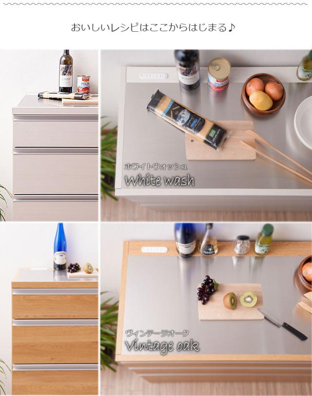■商品について/人気のステンレス天板キッチンカウンターが、現在の住宅カラーに合わせてリニューアル。うっすらと木目が見える北欧カラーのホワイトウォッシュ色、深みのある木目が特徴的なヴィンテージカラーのヴィンテージオーク色、清涼感のある光沢が美しい艶出しホワイト色の3色をご用意。インテリア性を重視したデザイン、収納しやすさを追求した引出、家電製品の配線を考慮したコンセント、間仕切りとしても使えるスッキリとした背面。一人暮らし、二人暮らしにも使いやすいサイズ感がうけています。