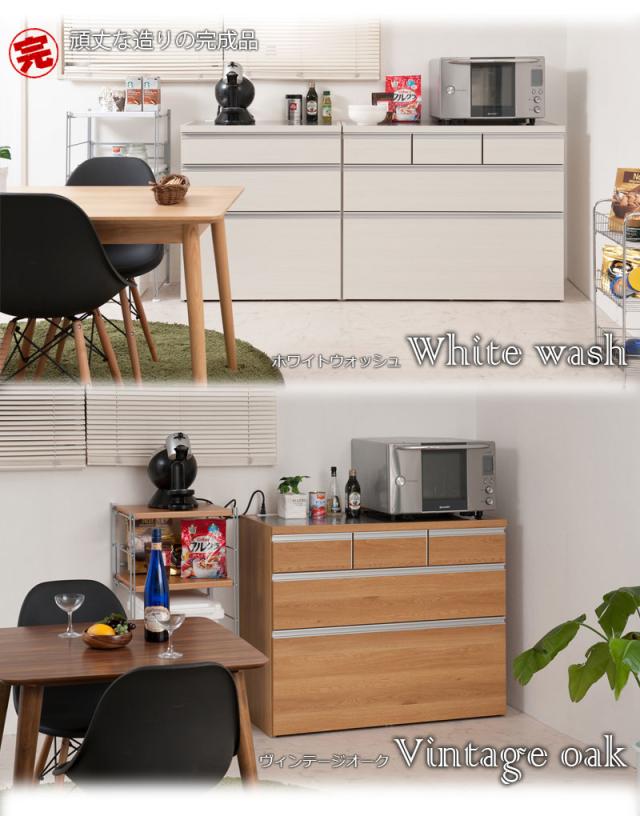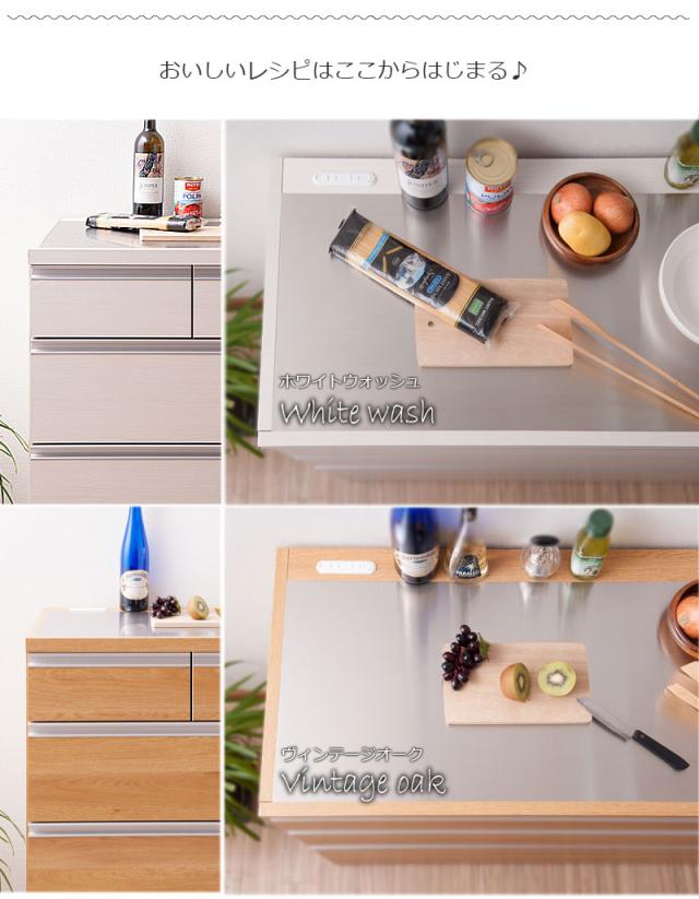 ■商品について/人気のステンレス天板キッチンカウンターが、現在の住宅カラーに合わせてリニューアル。うっすらと木目が見える北欧カラーのホワイトウォッシュ色、深みのある木目が特徴的なヴィンテージカラーのヴィンテージオーク色、清涼感のある光沢が美しい艶出しホワイト色の3色をご用意。インテリア性を重視したデザイン、収納しやすさを追求した引出、家電製品の配線を考慮したコンセント、間仕切りとしても使えるスッキリとした背面。一人暮らし、二人暮らしにも使いやすいサイズ感がうけています。