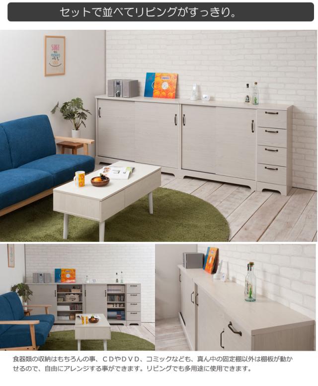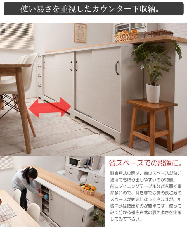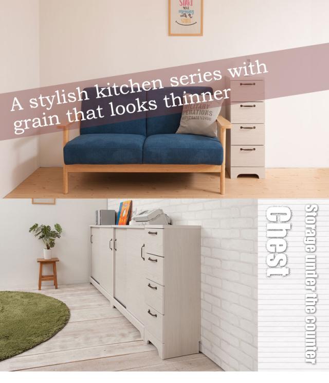 ■商品について/うっすら木目を生かしカントリーチックに仕上げたカウンター下シリーズ。鉄製トランク取っ手、アーチ状の台輪部など、細部にこだわったお洒落なシリーズ。省スペースで使える引戸式扉で、限られた空間に収納機能を凝縮。カウンター下やリビングなど様々なシーンで活躍する薄型キャビネットは幅90、120にダストボックスまで取りそろえ、インテリア度アップ。ゴミ箱が入っているとは思えないダストカウンターはリビングでも活躍。