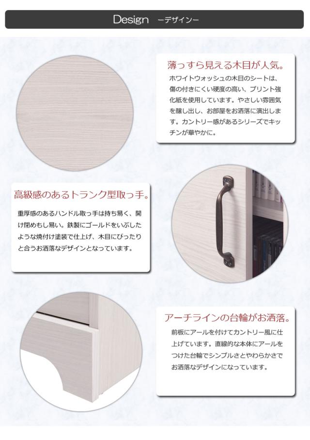 ■商品について/うっすら木目を生かしカントリーチックに仕上げたカウンター下シリーズ。鉄製トランク取っ手、アーチ状の台輪部など、細部にこだわったお洒落なシリーズ。省スペースで使える引戸式扉で、限られた空間に収納機能を凝縮。カウンター下やリビングなど様々なシーンで活躍する薄型キャビネットは幅90、120にダストボックスまで取りそろえ、インテリア度アップ。ゴミ箱が入っているとは思えないダストカウンターはリビングでも活躍。