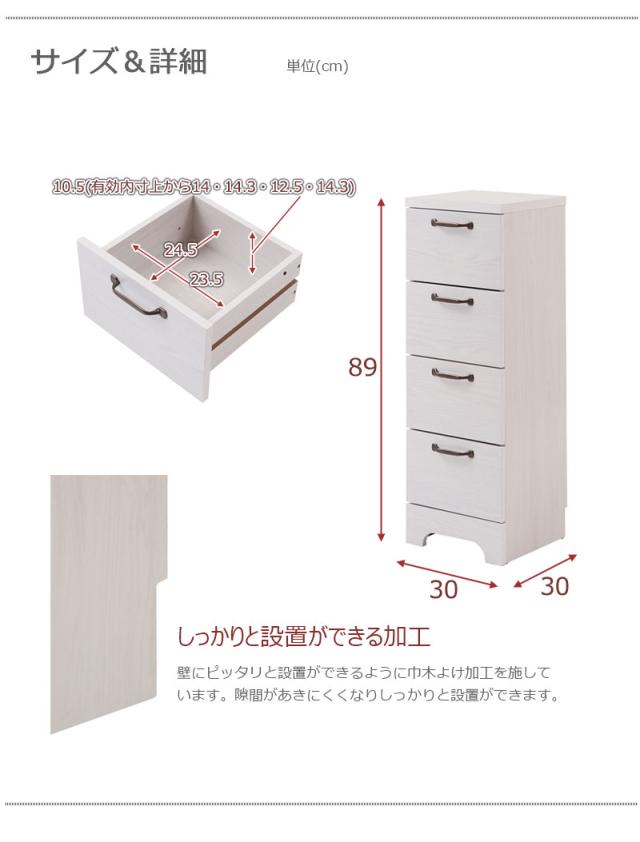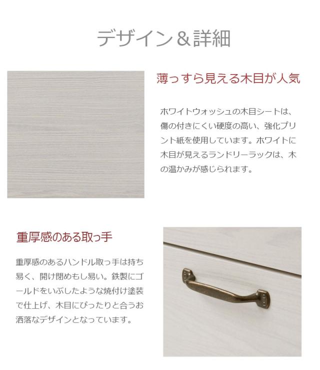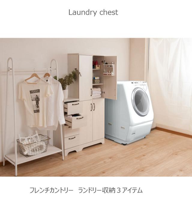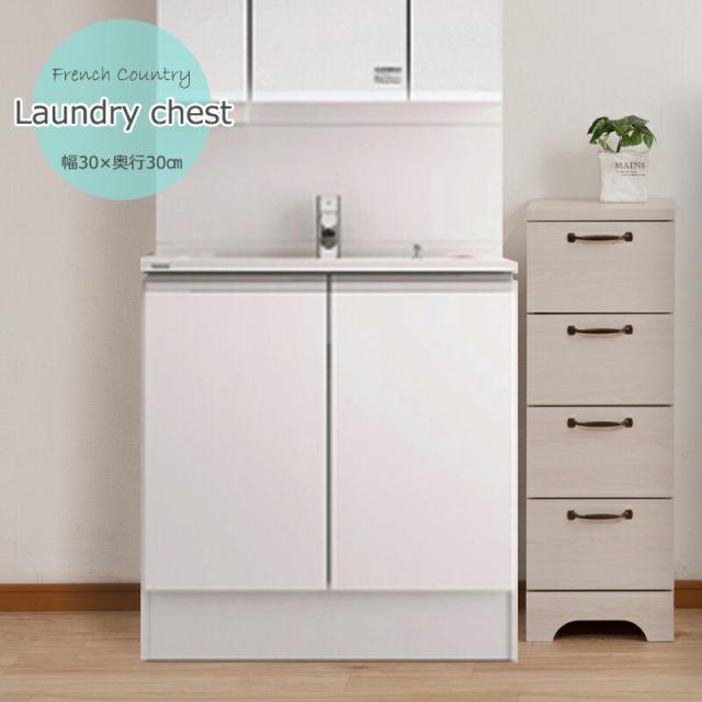 ■商品について/うっすら木目を生かしカントリーチックに仕上げたランドリーラックシリーズ。鉄製トランク取っ手、アーチ状の台輪部など、細部にこだわったお洒落なシリーズ。省スペースで使える奥行約30cmで、限られた空間に収納機能を凝縮。下着やヘアワックスなどコスメの収納に便利なチェストタイプ、詰め替え用のシャンプーやビッグサイズの柔軟剤、バスタオルなどストックに最適なストッカータイプ、ストッカーに更に収納量増しの上置き付きタイプと3種をご用意。