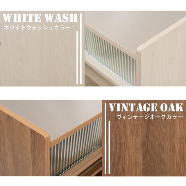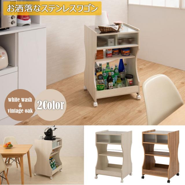 ■商品について/ステンレス天板に仕上げたキッチンワゴンはオープンタイプで使いやすく移動もラクラク。うっすらと木目が見えるホワイトウォッシュカラーと深みのある木目が特徴的なヴィンテージカラーのヴィンテージオーク色の2カラー展開。両面から使える引き戸ガラスがクールな印象。ストックのミネラルウォーターや乾麺など大量収納可能なストッカーとしてもGOOD!