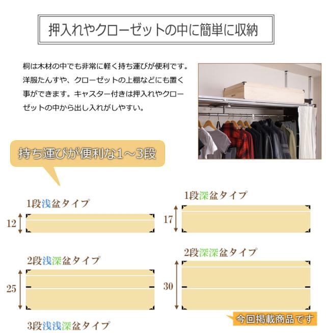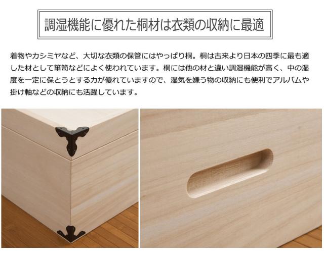 ■商品について/着物や浴衣の収納に定番の桐衣装箱。洋室などのフローリングにも合うデザインで和室だけでなく幅広いシーンにはまります。桐材は内部を一定の湿度に保とうとする働きがあるので大事な着物や洋服などを湿気から守る桐箱にしまうのがベスト。クローゼット上などコンパクトな1段タイプからラインナップし、着物や浴衣、洋服など長期保管に最適です。別売りの衣装盆で買い足し積み重ねができるので増える着物と洋服をしっかり収納。