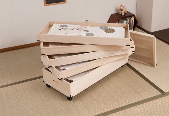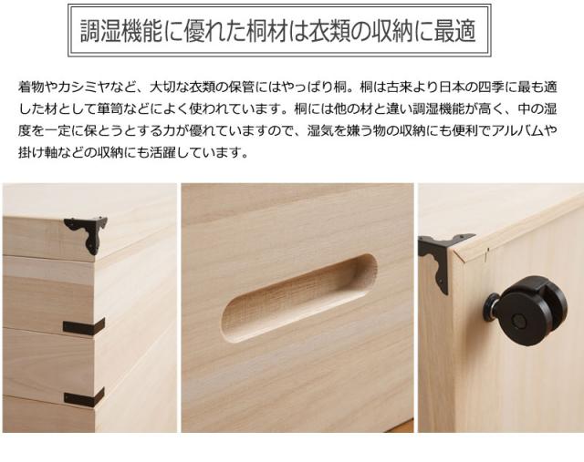 ■商品について/着物や浴衣の収納に定番の桐衣装箱。洋室などのフローリングにも合うデザインで和室だけでなく幅広いシーンにはまります。桐材は内部を一定の湿度に保とうとする働きがあるので大事な着物や洋服などを湿気から守る桐箱にしまうのがベスト。クローゼット上などコンパクトな1段タイプからラインナップし、着物や浴衣、洋服など長期保管に最適です。別売りの衣装盆で買い足し積み重ねができるので増える着物と洋服をしっかり収納。
