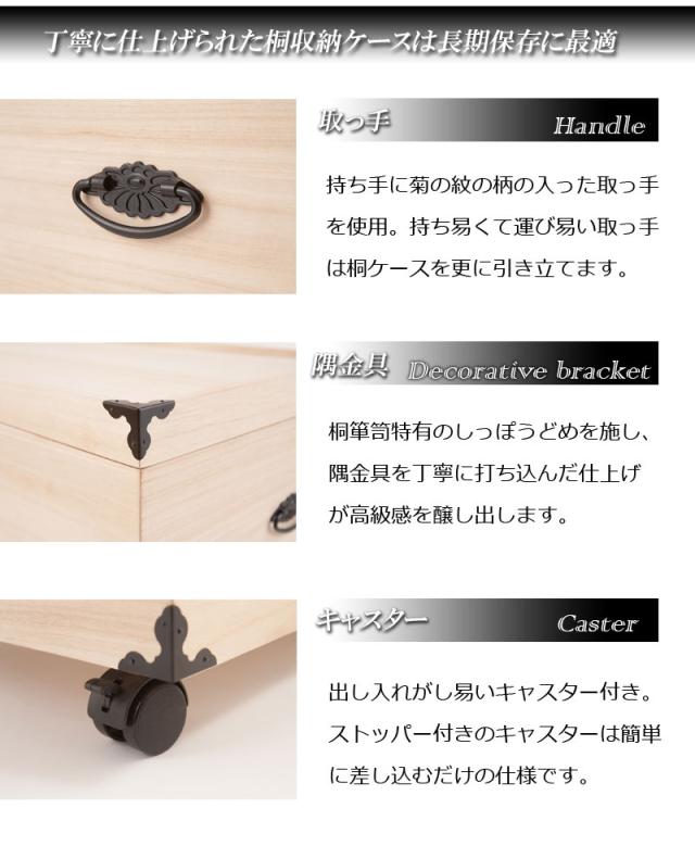 ■商品について/桐材は内部を一定の湿度に保とうとする働きがあるので、ひな人形や大事な着物などを湿気から守る桐箱にしまうのがベスト。もちろん押し入れやクローゼットに入るサイズで仕上げ、長期保管に最適です。冬物のかさばる大きな布団や毛布、衣類など保管したいものは全てここに。キャスター付きなので移動や出し入れが楽々!桃の節句のお雛さんや端午の節句の兜を収納するのにとても便利で重宝すること間違いなしです!
