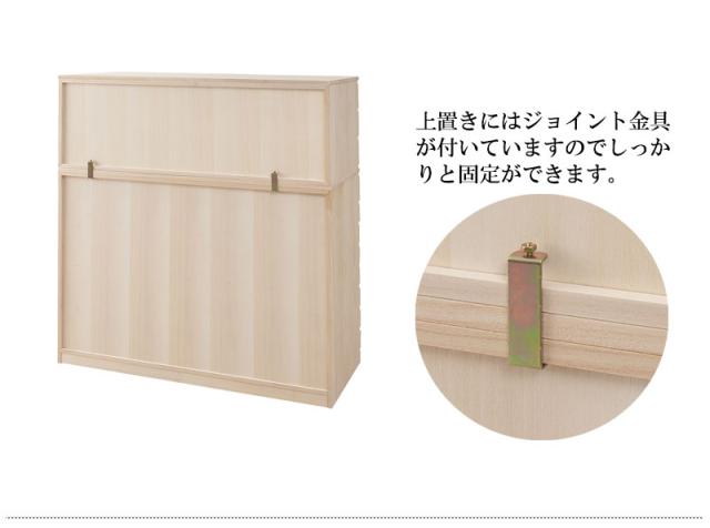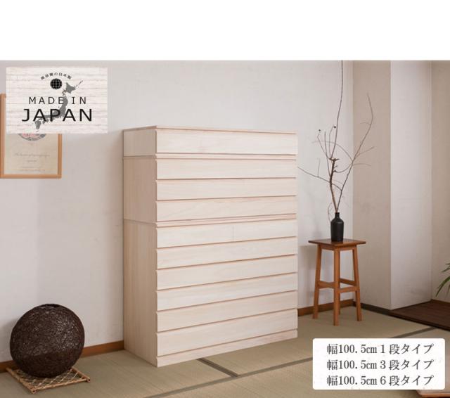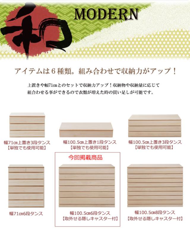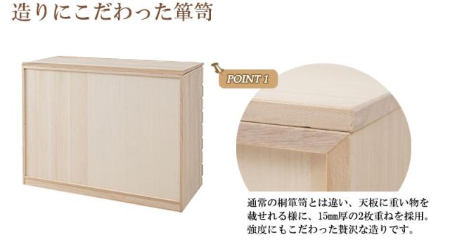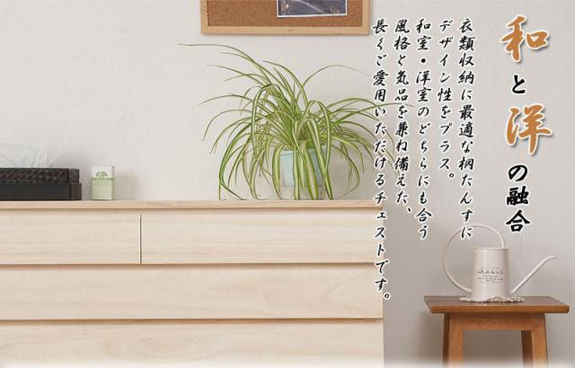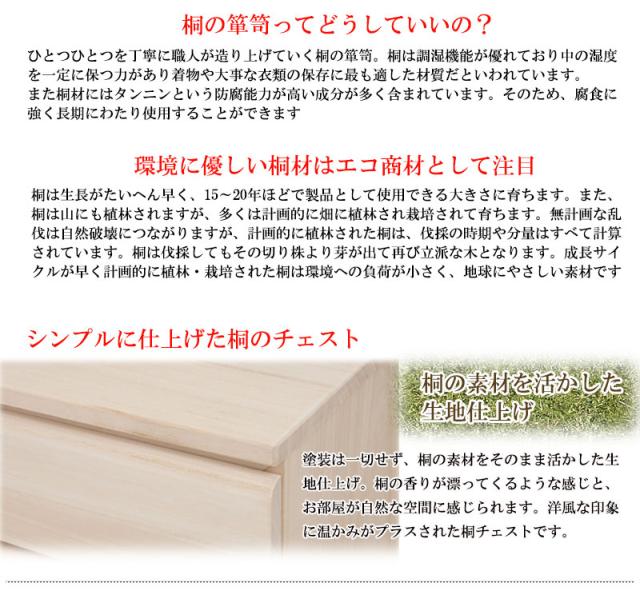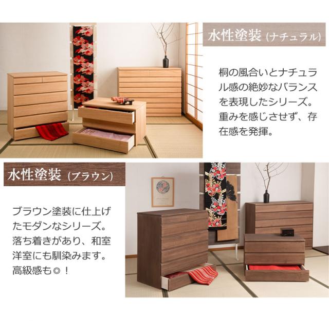 ■商品について/取っ手金物を排除し桐箪笥の概念を覆したモダンな印象の桐箪笥。和室はもちろん、洋室にも合うこだわり設計。桐の素材の風合いをそのまま活かした生地仕上げ、緩やかな木目を生かしたナチュラル、ブラウンカラーの3タイプをご用意。多段のラインからできる影は見てるだけで心地いい。通常の桐箪笥とは違い、天板に重い物を載せれる様に、15mm厚の2枚重ねを採用したところもこだわりポイントです。桐材は着物や浴衣、洋服など長期保管に最適です。