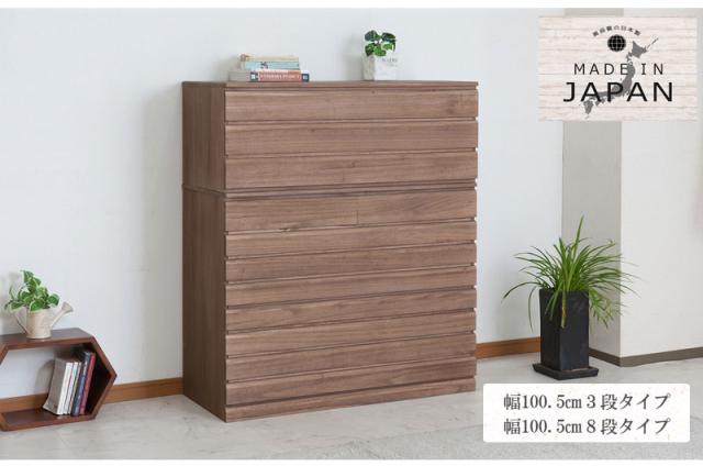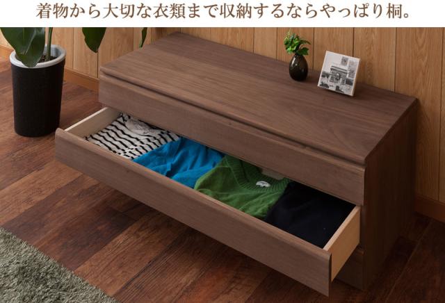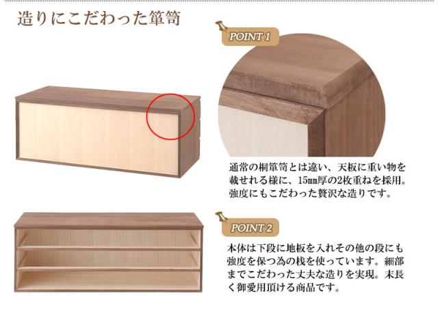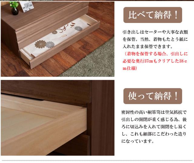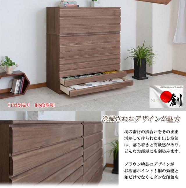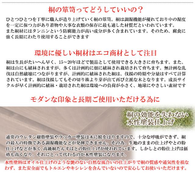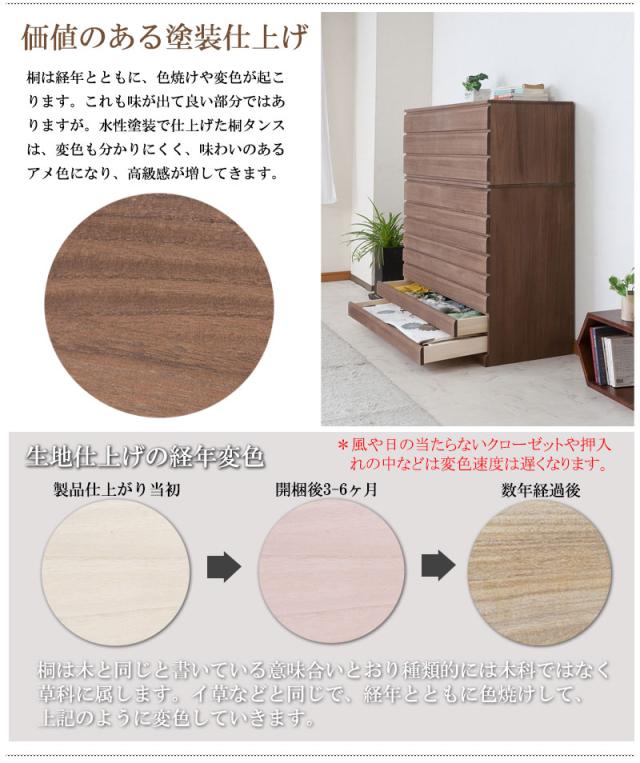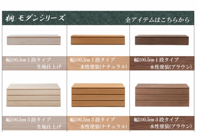 ■商品について/取っ手金物を排除し桐箪笥の概念を覆したモダンな印象の桐箪笥。和室はもちろん、洋室にも合うこだわり設計。桐の素材の風合いをそのまま活かした生地仕上げ、緩やかな木目を生かしたナチュラル、ブラウンカラーの3タイプをご用意。多段のラインからできる影は見てるだけで心地いい。通常の桐箪笥とは違い、天板に重い物を載せれる様に、15mm厚の2枚重ねを採用したところもこだわりポイントです。桐材は着物や浴衣、洋服など長期保管に最適です。