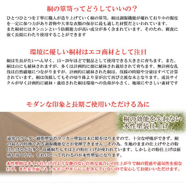 ■商品について/取っ手金物を排除し桐箪笥の概念を覆したモダンな印象の桐箪笥シリーズに三つ折り着物・帯・小物収納に最適なサイズが登場。和室はもちろん、洋室にも合うこだわり設計。桐の素材の風合いをそのまま活かした生地仕上げ、緩やかな木目を生かしたナチュラル、ブラウンカラーの3タイプをご用意。多段のラインからできる影は見てるだけで心地いい。通常の桐箪笥とは違い、天板に重い物を載せれる様に、15mm厚の2枚重ねを採用したところもこだわりポイントです。桐材は着物や浴衣、洋服など長期保管に最適です。
