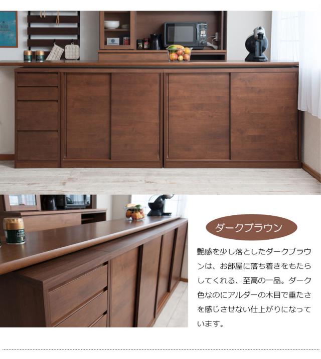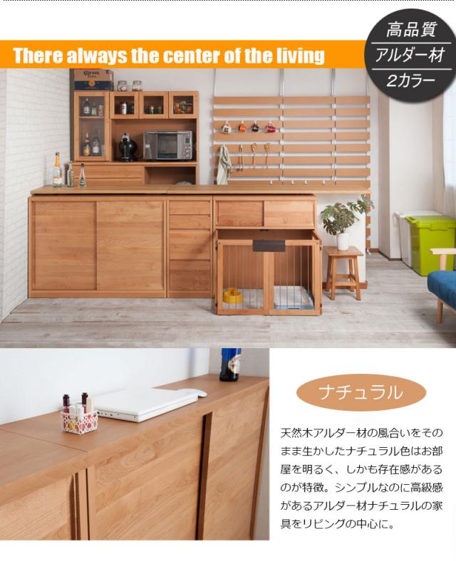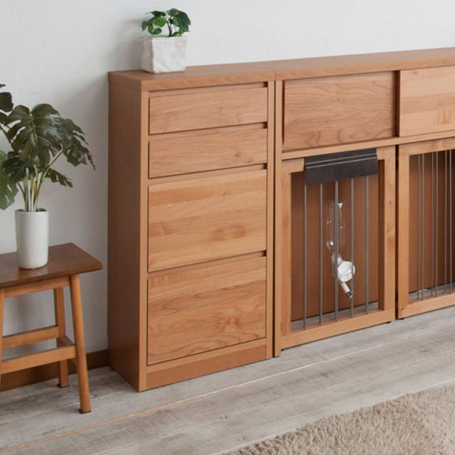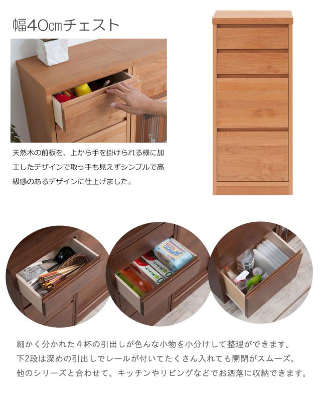 ■商品について/スッキリとしたデザインの扉や前板は木目の綺麗なアルダー材を使用。アルダー材特有の美しい木目をそのままいかした天然木の温かみを是非。手をかけやすく、すっきりとした掘り込みの取っ手は天然木ならではの加工。細かく分かれた4杯の引出しが色んな小物を小分けして整理ができます。下2段は深めの引出しでレールが付いてたくさん入れても開閉がスムーズ。他のシリーズと合わせて、キッチンやリビングなどでお洒落に収納できます。