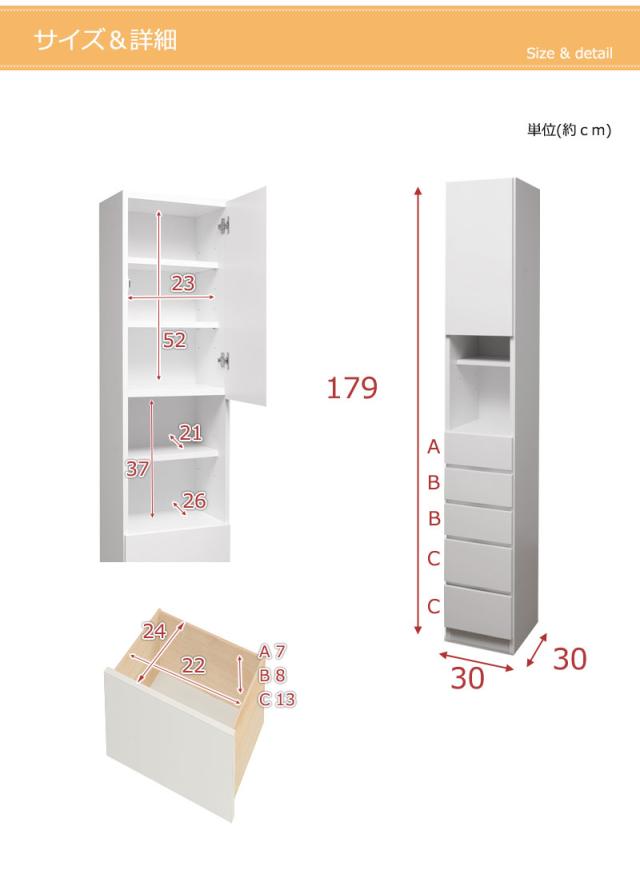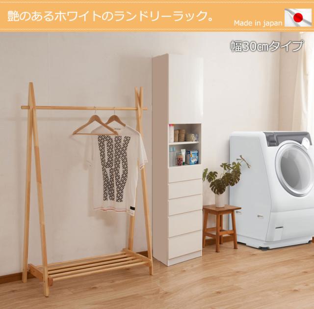 ■商品について/前板には水に強く、汚れもサッと拭き取れる光沢のあるポリエステルを使用。ランドリー廻りを整頓でき、常に綺麗に保てます。ランドリーに欠かせないのは、収納量。仕分けに便利な多引出し付きで、尚且つ奥行30cmの省スペース設計。