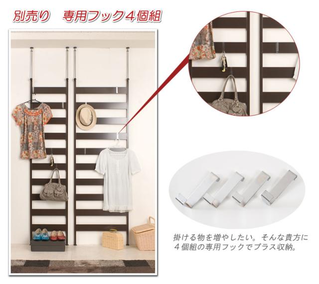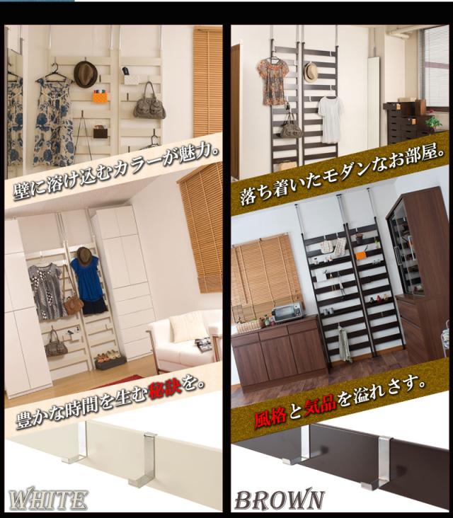 ■商品について/人気の突っ張り壁面ラダーラックがサイズ・カラー全24タイプになって新登場!お部屋に違和感なく馴染む、お洒落なラダーラックで可愛くディスプレイ!!壁に一体化した清潔感あふれるアイボリー系ホワイト、スタイリッシュに飾るならやっぱりシルバー、モダンな雰囲気が大人の落ち着きを与えてくれるブラウン、アクセントが決め手の赤は可愛く飾るのも良し、お洒落に格好良く飾るのも良し、ガーリー系にもマッチング!フック&棚付き、シンプルなフックのみタイプから選べます。
