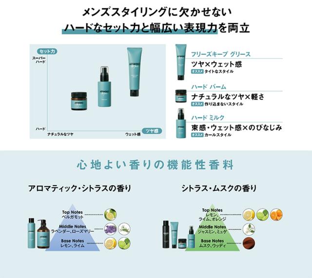 ミルク状で毛先までのびがよく、程よい束感とウェット感を表現。長時間スタイルをキープするハードなセット力。 |