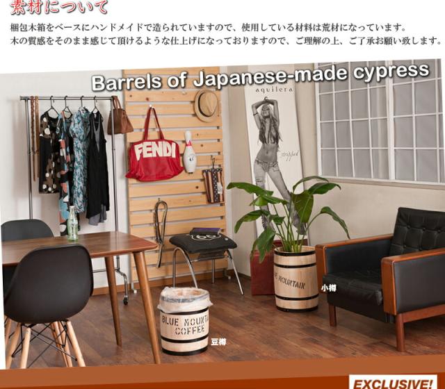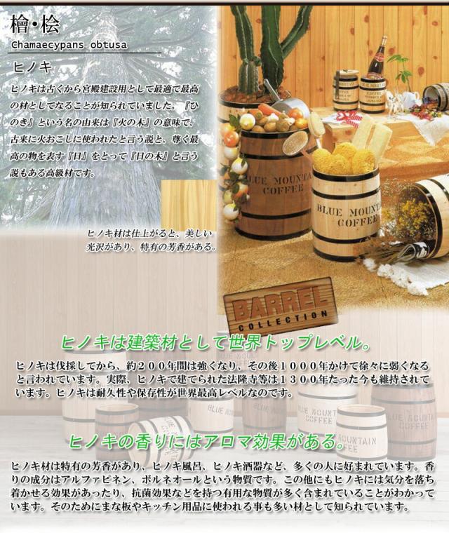 ■商品について/輸入したコーヒー豆の樽をイメージした、国産のヒノキを使用した雰囲気あふれる木樽です。ひのきは防虫効果が高く森林浴の成分も含む、うれしい一品です。前後に入っているロゴ(豆樽のみ片面ロゴ)がなんともお洒落。用途に合わせて選べる5サイズと雰囲気に合わせて選べる2カラー、さらに樽型の傘立もラインナップ。ワインやおもちゃなどインテリア収納としてはもちろん、お店のディスプレイ什器としても大活躍。これひとつで雰囲気最高のインテリアを楽しめます。溢れた靴をつっこんだり、ポスターを放り込んだり、テーブル台にしたりと使い方は様々。