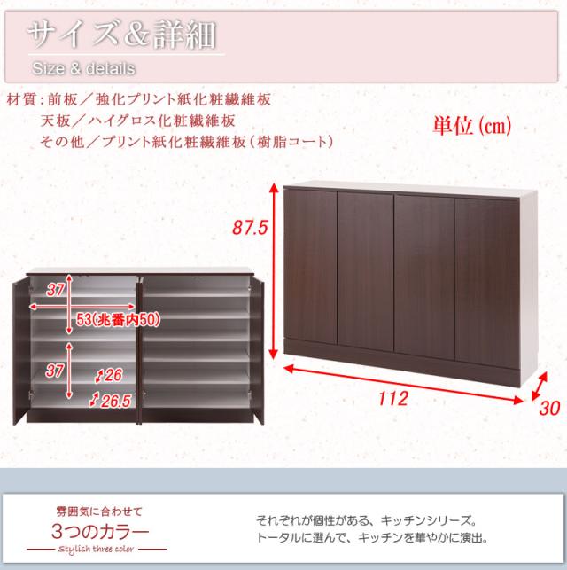 ■商品の仕様/前板:強化プリント紙化粧繊維板、天板:ハイグロス化粧繊維板、その他:プリント紙化粧繊維板(傷に強い樹脂コート加工)