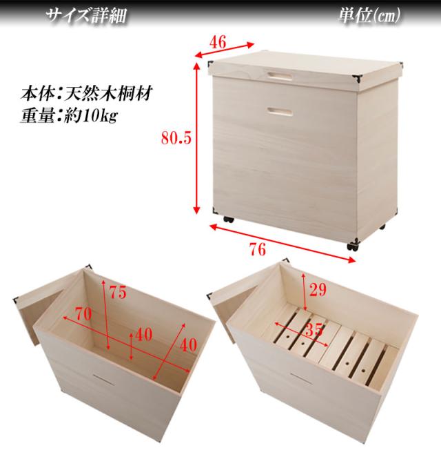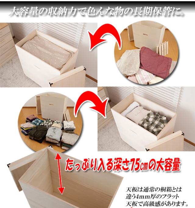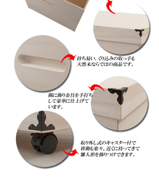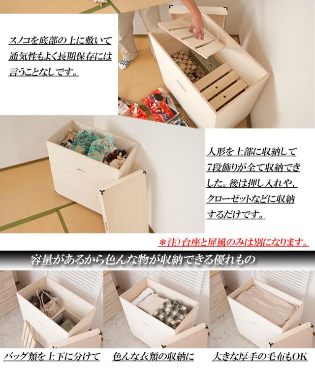■商品について/年間でほとんどを収納している雛人形はきちんと保管したい、大事な物は桐の収納ケースできちんと収納したいを可能にした深型桐収納ケースが新登場!雛人形7段飾りも収納できる(台と屏風は除く)大容量の収納力で色んな物の長期保管に最適。たっぷり入る深さ75cmの大容量で布団や衣類などの保管にも。天板は通常の桐箱とは違う4mm厚のフラット天板で高級感があります。持ち易い、くり込みの取っ手も天然木ならでは。隅に飾り金具を手打ちして豪華仕様に加え、キャスター付で移動も楽々、近くに持ってきて雛人形を飾りつけできます。量が入るから色んな物が収納でき、取外し可能なスノコでバッグ類を上下に分けたり、衣類・布団等かさばる物の収納にGood。