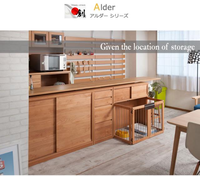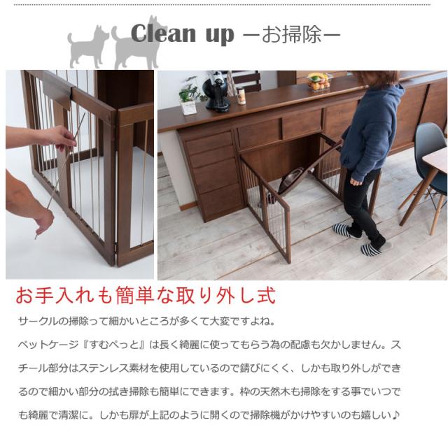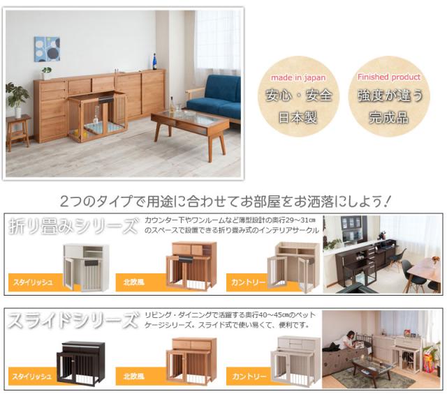 ■商品について/スッキリとしたデザインの扉や前板は木目の綺麗なアルダー材を使用。アルダー材特有の美しい木目をそのままいかした天然木の温かみを是非。木製ワンタッチでたたんでしまえる収納型ケージ。インテリア性も兼ね備えたペット家具『すむぺっとシリーズ』。手をかけやすく、すっきりとした掘り込みの取っ手は天然木ならではの加工。愛犬をサークルに入れるときだけ広げるので、普段は収納キャビネットのように使えるのが魅力。本体の奥行は約29.5でカウンター下や窓下に置いても邪魔にならないサイズ感。他のシリーズと合わせて、キッチンやリビングなどでお洒落に収納できます。