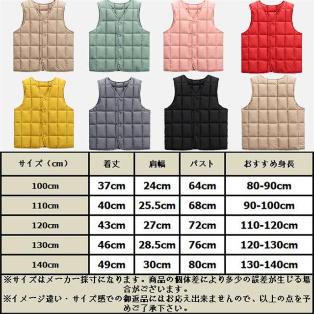 - 中綿ジャケットの下にダウンベストを着せたくてライトグリーンの110サイズを購入しました。 身長93cmで普段は95もしくは少し大きめの100を着せてますがこのダウンベストは110を購入し着せてみたら良い感じでした。 縫製はしっかりしていました。