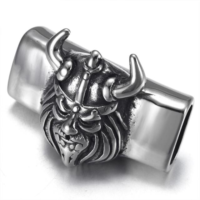 角付きのヘルメットを被った海賊をモチーフにしたかっこいい12ミリx6ミリの平らな皮ひもを通せるサージカルステンレス316L製のステンレスパーツ。6ミリの皮ひも2本を通すこともできるので、2連風のバングルにも対応できるステンレス製のコネクターパーツ。