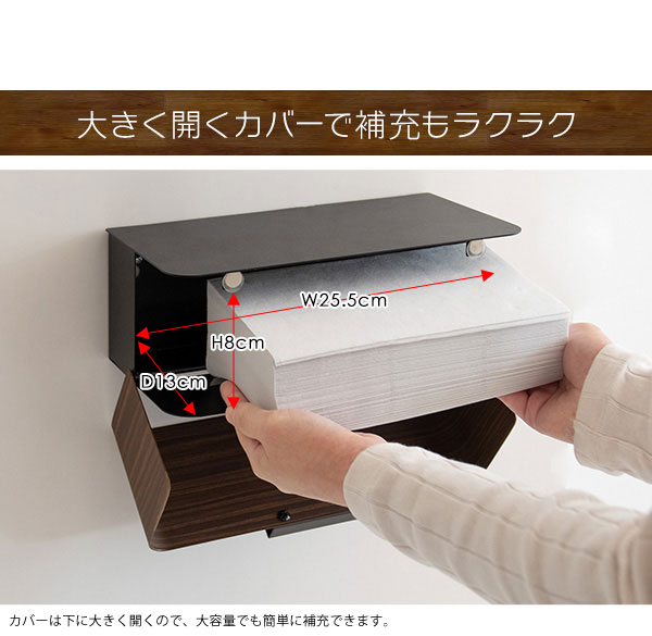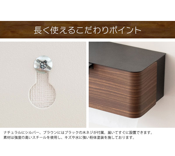 | 商品説明 | 上品な木目転写が特徴のスタイリッシュなペーパータオルホルダー。 壁にネジ止めするだけの簡単設置で、洗面所やキッチンで省スペースで使用することができとても便利。 ホルダーに収納しておくことでペーパータオルをいつも清潔に保てます。 大きく開くカバーで、大容量のペーパーもラクラク補充。 カラーは爽やかなナチュラルとシックなブラウンの二色をご用意しました。 美しい木目柄とスチールの組み合わせがどんなインテリアにも馴染みます。 |