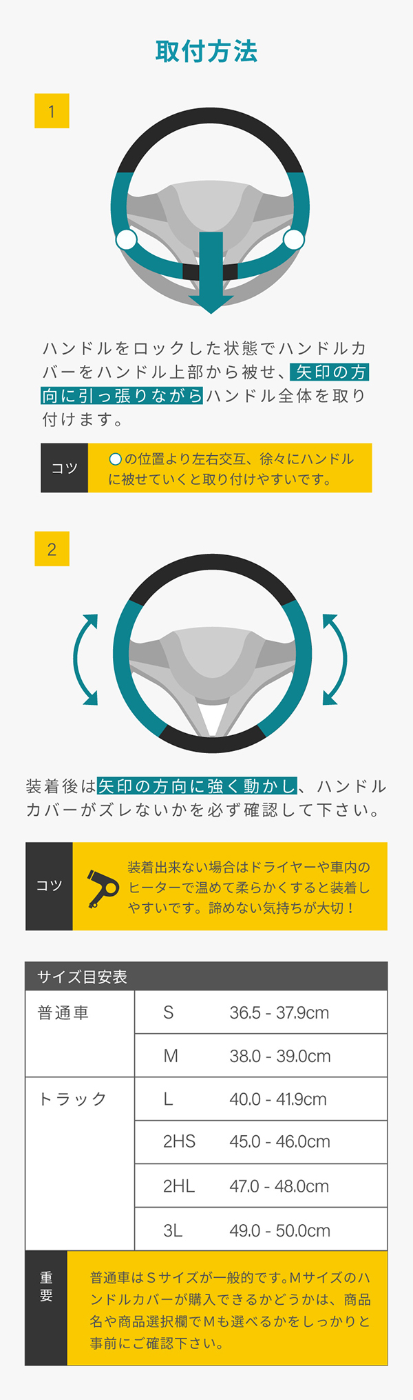 | ◆注意 | ※ ご購入前に、必ずステアリングのサイズをご確認下さい。 ※ 本革仕様・塗装仕様(木目調処理含む)の一部ステアリングにはご使用になれない場合が御座います。 ※ 本製品は純正ステアリングを対象としたカバーです。純正品以外のステアリングにはご使用になれない場合が御座います。 ※ ハンドルカバーはピッタリとフィットさせるため若干小さめに作られています。 ※ 長期間直射日光を受けると、日焼けにより色あせすることがあります。 ※ 色合につきましては、お使いのモニターにより若干異なる場合があります。 |