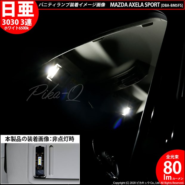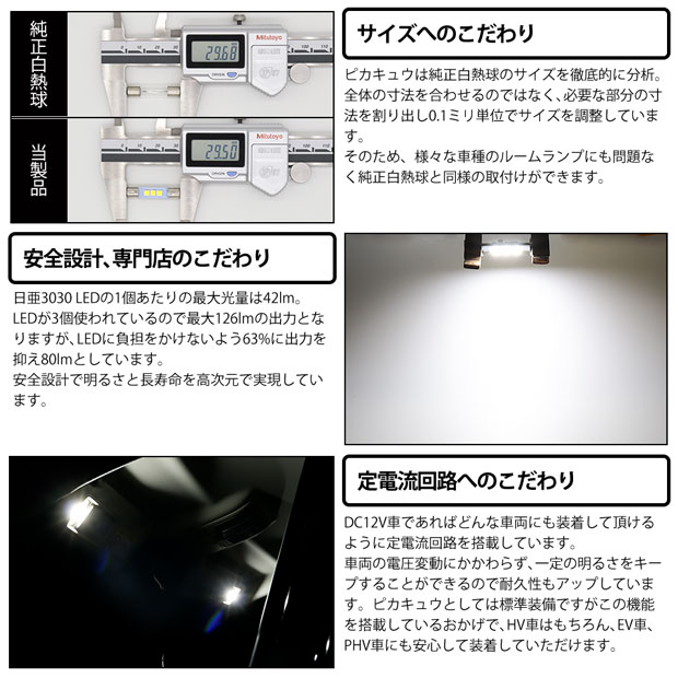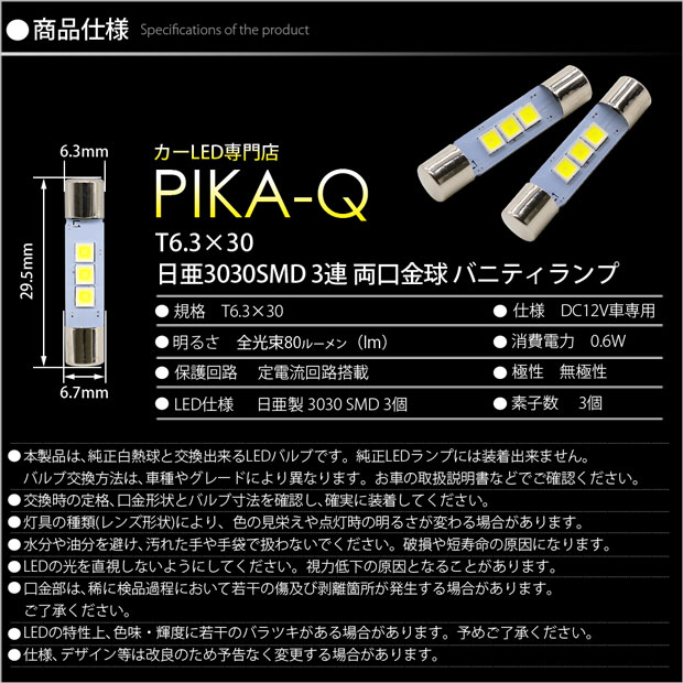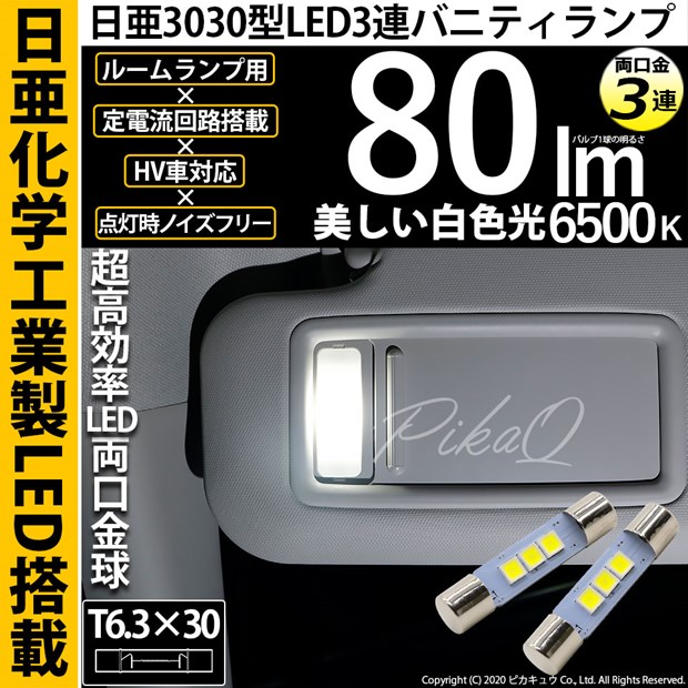 日亜化学工業製 3030 LEDを使用したバニティランプ用T6.3×30規格のバルブです。明るさ80lmです。 日本国内のLEDメーカー、日亜化学工業製のLED素子を使用しています。 純正のLEDライトや信号機にも使われるメーカーで品質は一級品です。 バルブには正面に合計3個のLEDが実装されており、ルームランプの必要な方向にのみ照射します。 青味や黄味のない純白色6500Kです。 純正白熱球を徹底的に分析し、サイズにこだわり様々な車種に純正球と同様に取付けができます。 LEDの最大出力から63%に出力を抑え、LEDに負担をかけない安全設計。それでも80ルーメンの高出力バルブとなります。 | ||||