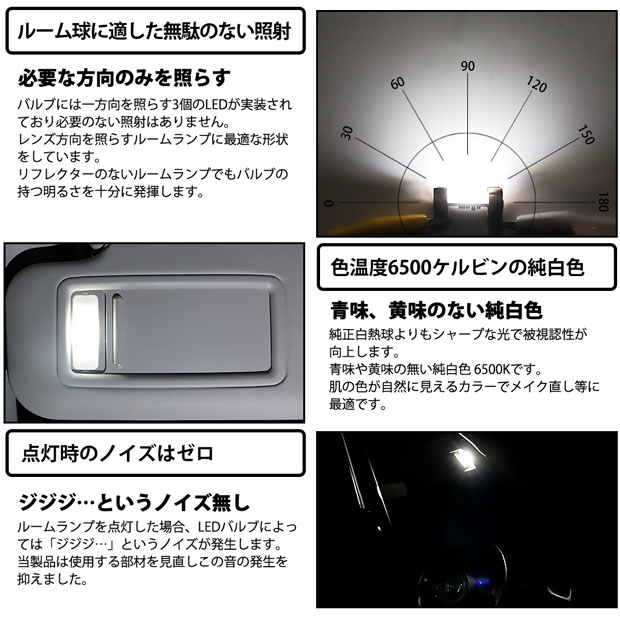 | ルーム球に適した照射 | 側面方向に3個のLEDを実装。ルームランプに最適なレンズ方向のみの照射です。リフレクターのないルームランプでもバルブの持つ明るさを十分に発揮します。 | |||