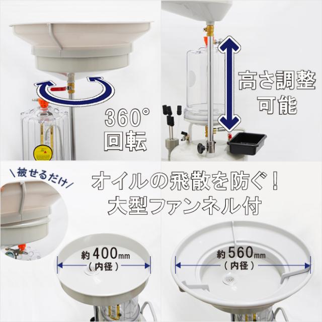 大型ファンネル付!上抜き・下抜き兼用オイルチェンジャー ●取外し可能な大型ファンネル付きで、下抜きの際にオイルの飛散を防ぎます 受け皿は高さ調節や回転が自由自在にできます ●上抜き時はエアーに接続し、ベンチュリ効果で透明タンクを負圧にする事でオイルを強力に上抜き(バキューム)します ※オイルを抜き取る前にはエンジンを暖機してオイルを暖めてから行って下さい (乗用車の場合:抜取り時間/通常約2〜3分) ●オイルの排出にモーターを使用せず、エアーの力だけを使用する単純構造なので、故障の心配がありません エアーコンプレッサー(二馬力以上)をご使用ください ●上抜きしたオイルは透明タンク(アクリル製)でオイル量と汚れを確認できます ●廃油の排出はエアー式で楽々 タンクの安全弁はタンクのエアー圧が一定圧以上になると開放します ●大型キャスターと自在キャスターでスムーズな移動が可能です ●組立てはお客様ご自身でお願い致します(15分程度、別途工具が必要になります) 【ご注意】 すべての車種に使えるわけではございません オイルレベルパイプに吸込みチューブが入らない車種もあります 排出のパイプは本体のタンク内に収納されております 組み立ての際は引き出してご利用下さい 別途部品の販売も行っております ・ファンネル(OD-FUN) ・ファンネル用カバー(OD-F/OD-FL) ・排出用ホース 品番:SET-OD-68P |