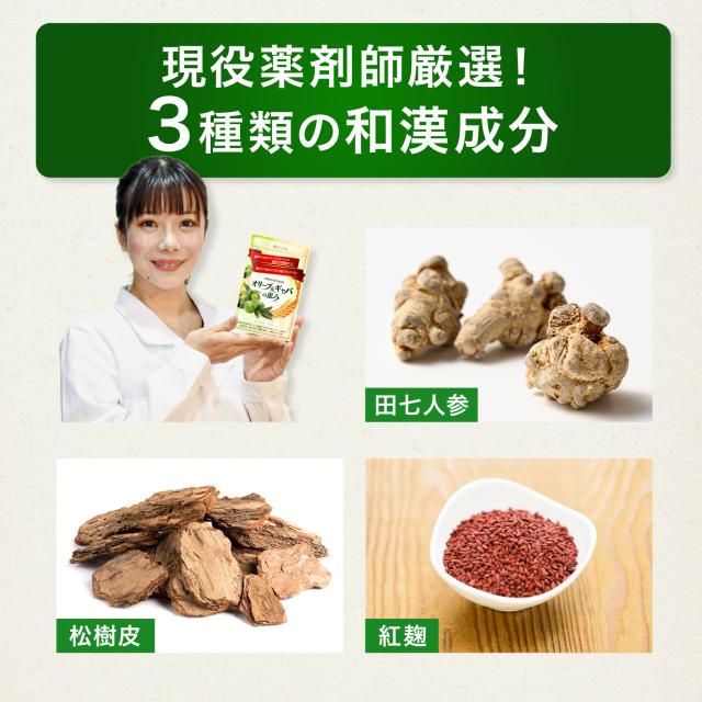 原材料:還元麦芽糖水飴(国内製造)、大麦乳酸発酵液ギャバ、デンプン、オリーブエキス末(デキストリン、オリーブエキス)、有機田七人参粉末、フランス海岸松樹皮エキス末、米紅麹末/セルロース、HPC、ステアリン酸カルシウム、微粒二酸化ケイ素