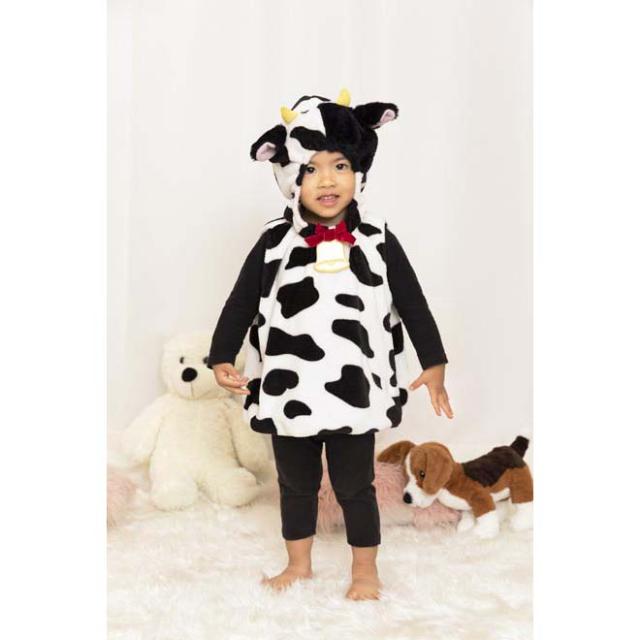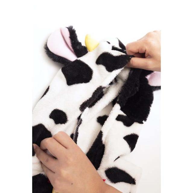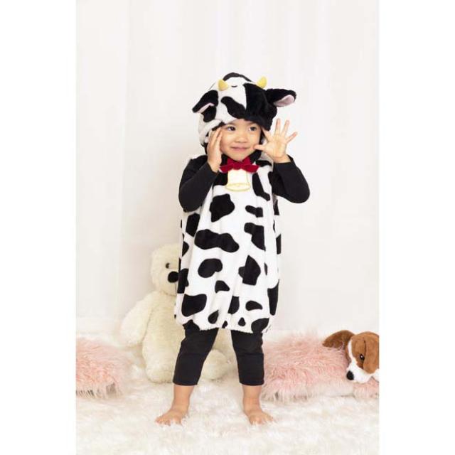 肌触りの良いふわもこ素材のうしさん着ぐるみ。首のリボン付きベルはワッペンのような作りで軽くて柔らかく安心です。着ぐるみは、ワンピースタイプだからオムツ替えも楽々。手洗い出来てお手入れが簡単なのも嬉しいポイント!首元や裾口がゴム仕様なので1〜2歳位まで長く着られます。顔周りにもゴムが入っているのでフードが脱げにくいです。SNS映えもばっちり!年賀状にもオススメです。
