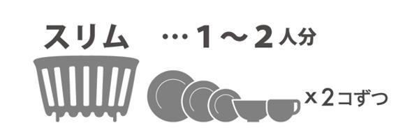 狭いキッチンでもシンクサイドのちょっとしたスペースに置くことができるスリム設計です。大皿・中皿・小皿、茶碗、グラス各2個ずつが収納目安で、一人暮らしの方や普段は食洗機使いの方などに最適な1〜2人分サイズです。