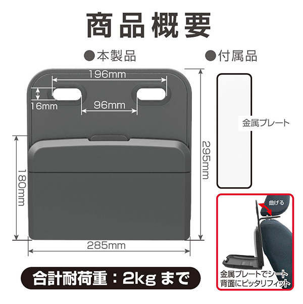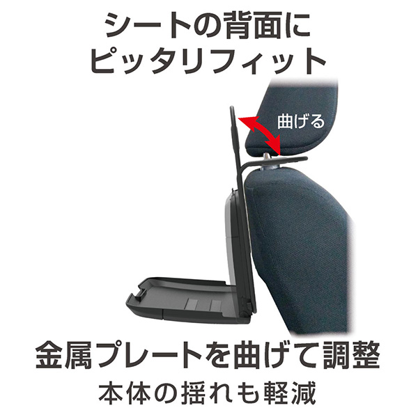 ●付属の金属プレートを曲げて調整することにより車のシート背面にフィットし、また本体の揺れも軽減します。