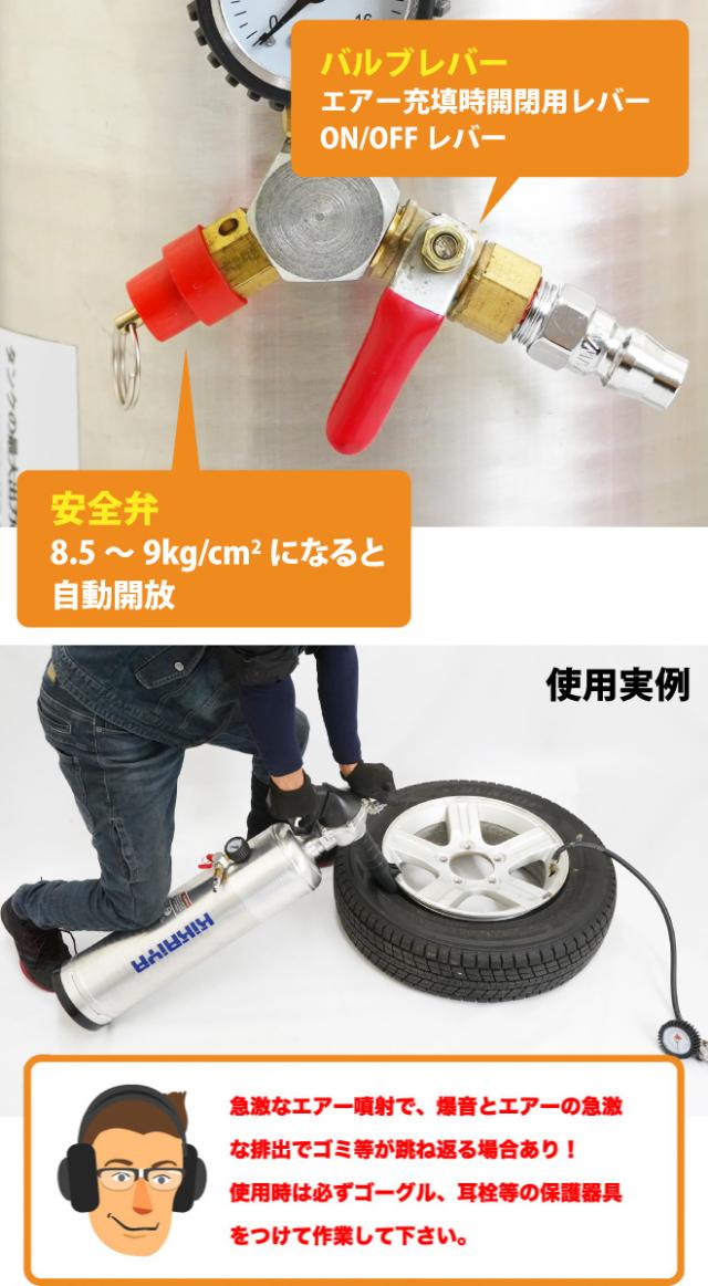 引っ張りタイヤや保管時のタイヤの潰れのビードアップに! ●急激なエアー噴射で、簡単にチューブレスタイヤのビードをあげることができる ツールです ●メーターを確認しながらエアー充填でき、ホイールのフチにノズルの先端を乗せ、 噴出トリガーを握るだけで簡単に素早くビードアップできます ●アルミボディで約4.3kgの軽さ ●新型構造で作業性と安定性が向上、使い勝手も抜群です ●直立型になったことでしゃがむことなく持運びができるようになりました ●自立するので場所を取らず、すっきり収納できる ※新品ですが、インポート品のため、製造過程で外見に傷、凹みがある場合が ございますが性能上問題ございません 外見保証はございませんので予めご了承ください 【ご注意】 ・かなり大きな音が出ますので、住宅街や夜間でのご使用にはご注意ください ・急激なエアー噴射で、爆音とエアーの急激な排出でゴミ等が跳ね返る場合もあります ・使用時は必ずゴーグル、耳栓等の保護器具をつけて作業して下さい |